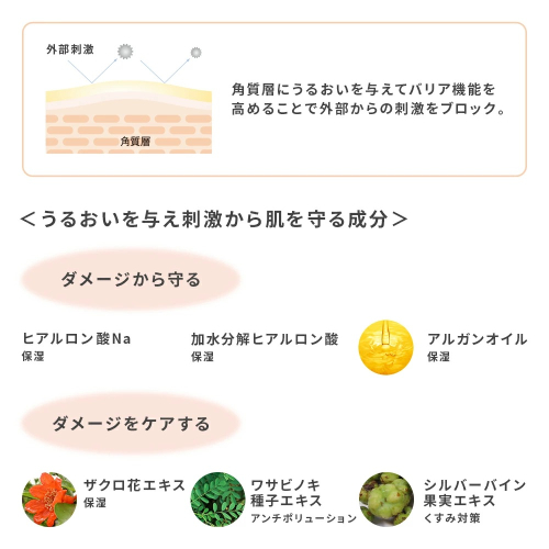 角質層に潤いを与えて、バリア機能を高めることで、外部からの刺激をブロックします。ベタつきを軽減し、軽い使い心地ですばやく肌に広がり、肌なじみがアップしました。