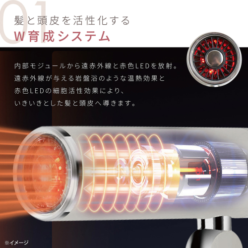遠赤外線が与える岩盤浴のような温熱効果と、波長の長い赤色のLEDの効果により、いきいきとした髪と頭皮へ導きます。