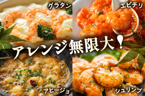 エビチリやエビマヨなどの中華はもちろん、ガーリックシュリンプやアヒージョ、サラダやピザのトッピングにも。