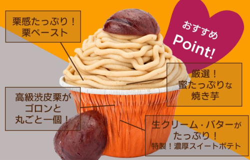 栗感たっぷりの栗ペーストとまろやかに仕上げた生クリーム!そして渋皮栗と蜜たっぷりさつまいも、特製スイートポテトが口の中で広がって、一度に全てが味わえる、幸せ溢れる史上最強の美味しさ!