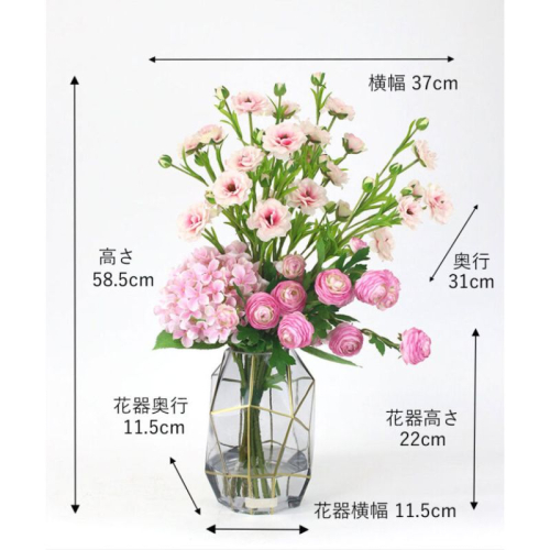 主材 花材:ポリエステル・プラスチック 花器:ガラス