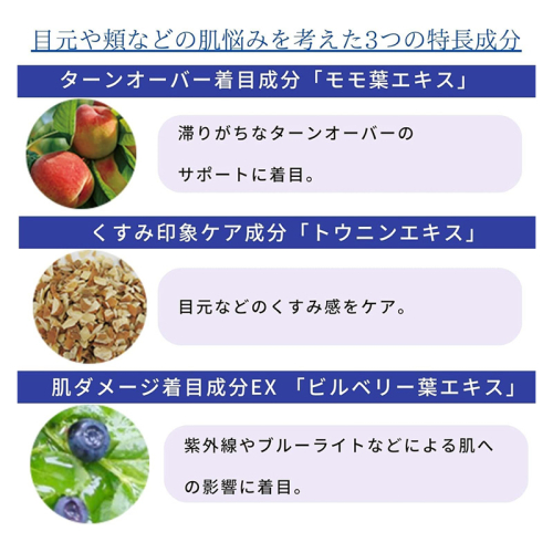 3.「ターンオーバー着目成分※2」「くすみ印象ケア成分※3」「肌ダメージ着目成分EX※4」配合で気になる部分の悩みに対しアプローチ。