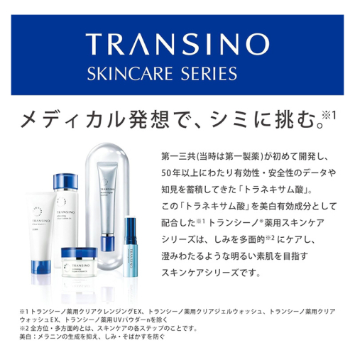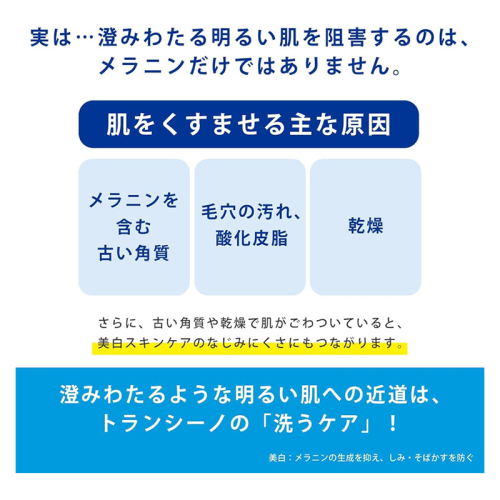 1.洗うだけで、透明感。トランシーノ「洗うケア」共通の、肌荒れ防止有効成分※1、くすみ感ケア成分(ビタミンC※2・アケビアエキス※3)、うるおい成分※4を配合。