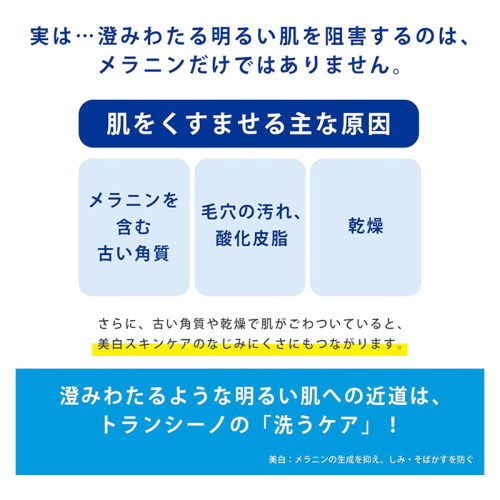 トランシーノ「洗うケア」共通の、肌荒れ防止有効成分※1、くすみ感ケア成分(ビタミンC※2・アケビアエキス※3)、うるおい成分※4を配合。