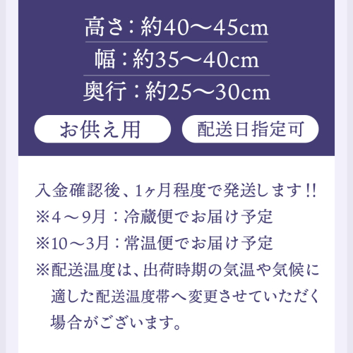 仏事の花をお届けします。 一級フラワー技能士が作成した仏事のアレンジメントです。 日付指定ができますので、命日 法事 お盆 秋彼岸 春彼岸 などに合わせてお届け可能です。 配送指定日対応可能となっております。 ご希望がございましたら下記メールアドレス宛に(お届け日、時間帯の希望など)ご連絡ください。 メールアドレス sakuragawa@furusato-g.com ※ご連絡いただけない場合、配送日は事業者おまかせになります。 【容量】 高さ 約40~45cm 幅  約35~40cm 奥行 約25~30cm 【申込期日】 通年 【発送期日】 常温配送・冷蔵配送 入金確認後、1ヶ月程度で発送 ※4~9月:冷蔵便でお届け予定 ※10~3月:常温便でお届け予定 ※配送温度は、出荷時期の気温や気候に適した配送温度帯へ変更させていただく場合がございます。 【事業者】 フローリストあすか 地場産品類型:3号 類型該当理由:市内の加工所で花を仕入れ、制作している
