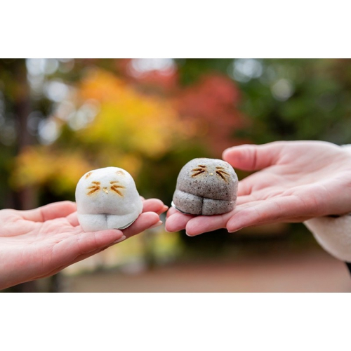 丹後の米粉を使った猫型の上用饅頭(黒猫は黒ゴマ味)とご一緒に、当店の季節の上生菓子をお楽しみください。