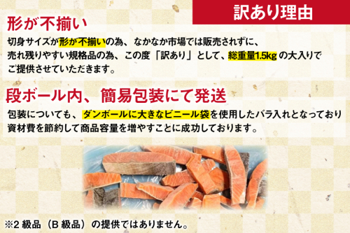 - 訳あり サーモン 【厚切り】 切身 骨取り 皮取り 無塩 総重量 1.5kg [足利本店 宮城県 気仙沼市 20565973] 魚 魚介類 冷凍 鮭 海鮮 魚介 規格外 不揃い さけ サケ 鮭切身 シャケ 切り身 サーモン切り身 訳アリ わけあり 簡易包装 家庭用 冷凍 骨なし