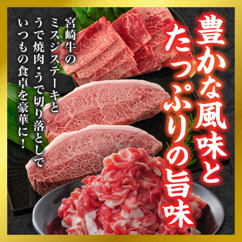 JAみやざき系統和牛枝肉共励会出展牛です。 『宮崎牛』は厳しい認証基準を設けており、宮崎県内で生産肥育された黒毛和牛で、日本食肉格付協会が定める格付基準の肉質等級4等級以上のものをブランド認証しております。 その『宮崎牛』の中でも最高級のA5ランクのきめ細やかなサシの入った「宮崎牛」です。 ミスジは、一頭からわずかな量しかとれない希少部位。口の中でとろけるようで、歯切れのよいあっさりとした食感です。甘みと風味を堪能できる濃厚な味わいで、霜降りの中でも格別です。 うで焼肉は、赤身の多い部位で濃い味わいとしっかりとした食感、旨味たっぷりで風味豊かなうでの切り落としは使い勝手の良い万能なお肉です。 様々なお料理をさらに美味しくしてくれる自慢の宮崎牛をぜひご堪能ください。