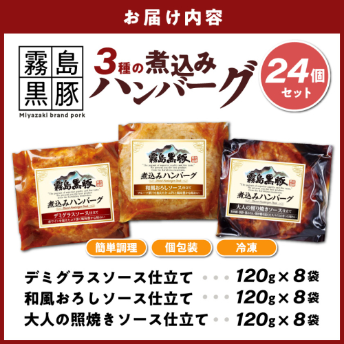 霧島黒豚 3種の煮込みハンバーグ 24個セット (デミグラスソース仕立て・和風おろしソース仕立て・大人の照焼きソース仕立て)≪みやこんじょ特急便≫_AC-28-001-24-Q
