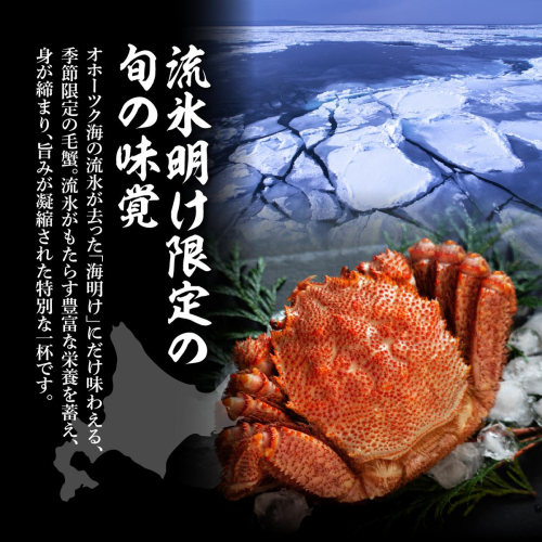 流氷がもたらす栄養をたくさん蓄えた毛ガニをご賞味ください。