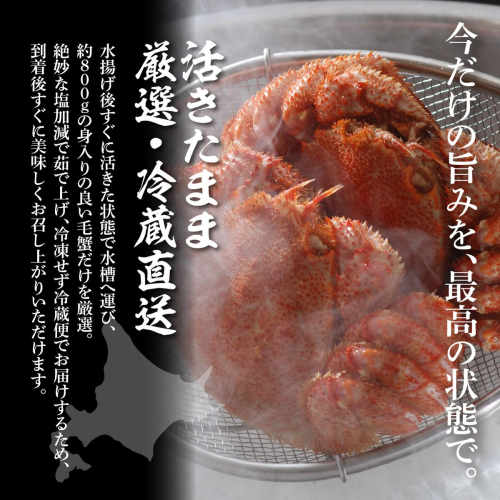 その中から特に身の締まった毛蟹1尾約800gを厳選し、絶妙な塩加減にて茹で上げ、一度も冷凍せずに冷蔵便にて出荷致します。