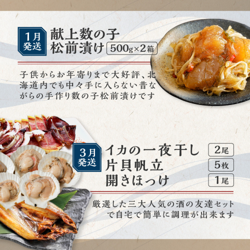 3月:イカの一夜干し[1袋2尾入り]、開きほっけ[1尾約500g]、片貝帆立[5枚]