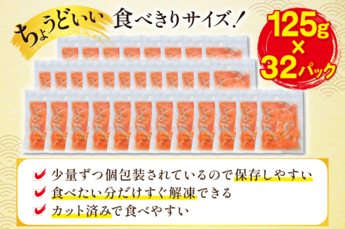 訳あり サーモン 切り落とし おさしみ用 計4kg 125g ×32p [足利本店 宮城県 気仙沼市 20565968] 魚 魚介類 鮭 お刺し身 刺し身 刺身 生 生食 個包装 チリ銀鮭 銀鮭 海鮮 海鮮丼 魚介
