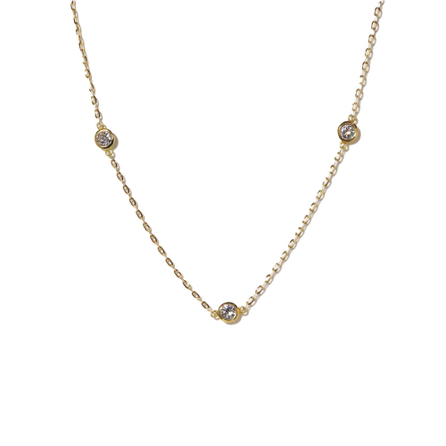 全長45cmの小豆チェーンに 覆輪留めした天然ダイヤモンドを3石セッティング。 石枠は全て9.2mmで統一感あり。 お顔周り・首周りを華やかにしてくれる一品になっております。 ———注意事項——— ・通常K18イエローゴールドの納品ですが、 K18ホワイトゴールド・K18ピンクゴールドも作成可能です。 ご相談ください。 ・ダイヤモンドのキューレットが肌にあたるデザインです。 ・石の色味やカットに個体差があるため、 画像と若干の違いがでる場合があります。