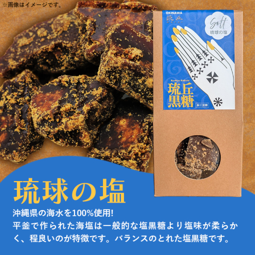 よく沖縄の塩として売られていても実は海外の塩が使われている事が多かったりしますが、こちらは沖縄の海水のみを汲み取り、平釜で作られた海塩を使用しております。一般的な塩黒糖より塩味が柔らかく、程良いのが特徴です。沖縄県民は熱中症予防に食べる塩黒糖ですが、塩の原料といい、水あめが入ってないことも含め、塩黒糖の最高峰と言っても良いでしょう。