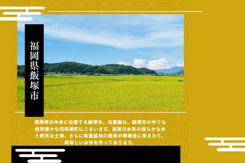 遠賀川水系の清らかな水と肥沃な土壌、さらに筑豊盆地特有の昼夜の寒暖差に育まれたお米は、炊き上がりのつややかさと、口に入れた瞬間に広がるやさしい甘みが魅力です。