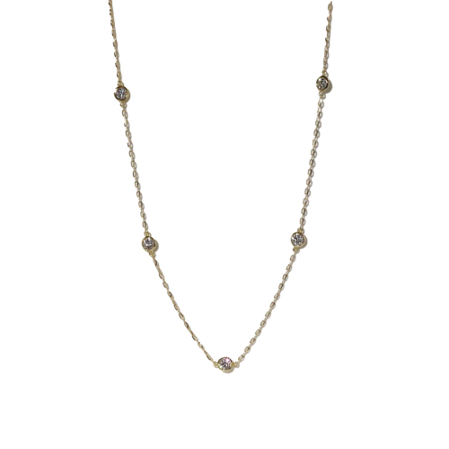 全長50cmの小豆チェーンに 覆輪留めした天然ダイヤモンドを5石セッティング。 全て同じサイズの石枠です。 お顔周りをとても華やかにしてくれる一品になっております。 ———注意事項——— ・通常K18イエローゴールドの納品ですが、 K18ホワイトゴールド・K18ピンクゴールドも作成可能です。 ご相談ください。 ・ダイヤモンドのキューレットが肌にあたるデザインです。 ・石の色味やカットに個体差があるため、 画像と若干の違いがでる場合があります。