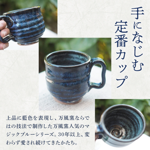 ◆◆濃厚な藍色を表現し、万風窯人気のマジックブルーシリーズ。◆◆ 上品に藍色を表現し、こだわりの技術で制作した万風窯人気のマジックブルーシリーズ。 内側に広がるのは、外側とはまったく違う景色。 蔵王の土と、自家製の藁灰釉(わらばいゆう)が生み出す釉薬の流れは、万風窯ならではの技法です。 取っ手には、万風窯オリジナルの「福耳デザイン」を採用。 毎日使うものだからこそ、飲みやすさと持ちやすさにとことんこだわりました。 30年以上、変わらず愛され続けてきたかたち。 万風窯の定番コーヒーカップです。 【提供:蔵王焼 万風窯 】