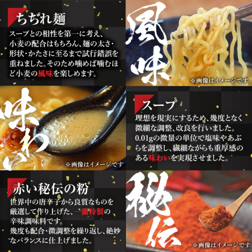 厳選した小麦を使用したもちもちのちぢれ麺は、スープによく絡み相性抜群。赤い秘伝の粉の適度な辛みは味を引き締め、麺やスープを一層引き立てます。