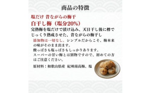 自然の力で育てた南高梅を塩だけで漬けた昔ながらの梅干しです(塩分20%)化学調味料は無添加。