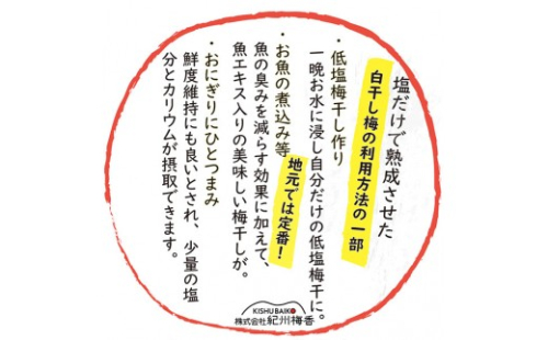 ※梅干しの表面及び汁に含まれる乳白色の液は、塩に含まれるカルシウムやマグネシウム等 にがりと言われる成分が結晶化 あるいは溶けたものです。カビ等ではなく自然由来のミネラルによるものですので 品質や安全性に影響はございません。気になる場合は水で洗って頂ければと思います。