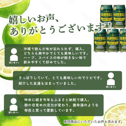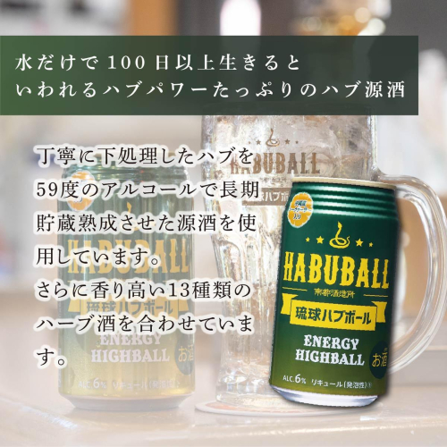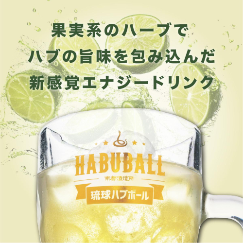 ■□■─────────────────────── 【2018沖縄南城セレクション 認定】 商品名:琉球ハブボール 「南城セレクション」とは 南城市の地域資源及び歴史・文化的にゆかりのあるものを 活用して開発された商品を市が推奨品として認定 ───────────────────────■□■ 神秘的な生命力を持つハブのエキスと13種類のハーブエキスをダブルブレンドした 沖縄生まれの新感覚エナジーハイボールです。 疲れやストレスを吹き飛ばすエナジフルな味わいにシークワーサー果汁を加え爽やかに仕上げました。 ※20歳未満の飲酒は法律で禁じられています。  20歳未満の方は酒類のお申込みはできません。 【琉球ハブボール】における、製造過程の大部分を南城市内の南都酒造所で行っております。