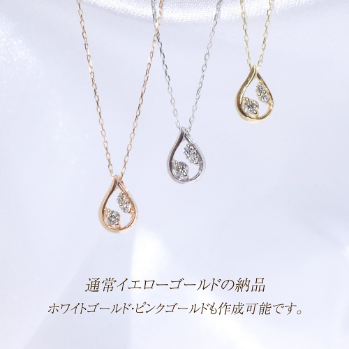 しずく型の枠に天然ダイヤモンドを3石セッティングした、 可愛らしいペンダント。 裏が抜けているようなデザインの為、 地金のラインも美しく輝きます。 普段使いから様々なイベント事まで幅広くお使いいただける一品です。 ———注意事項——— ・通常K10イエローゴールドの納品ですが、 K10ホワイトゴールド・K10ピンクゴールドも作成可能です。 ご相談ください。 ・石の色味やカットに個体差があるため、 画像と若干の違いがでる場合があります。 この返礼品については、製品製造の全工程を区域内で行っており、 返礼品の付加価値の7割以上を占めているため地場産品基準に適合しています。