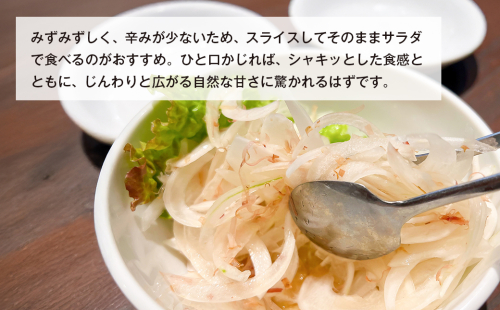 みずみずしく、辛みが少ないため、スライスしてそのままサラダで食べるのがおすすめ。ひと口かじれば、シャキッとした食感とともに、じんわりと広がる自然な甘さに驚かれるはずです。