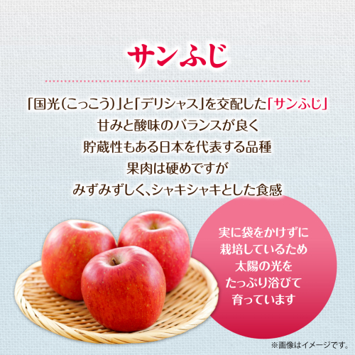 「サンふじ」は、「国光(こっこう)」と「デリシャス」を交配したりんごで、甘みと酸味のバランスが良く、貯蔵性もある日本を代表する品種です。