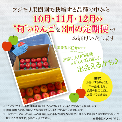フジモリ果樹園で栽培する品種の中から、配送時期に応じた“旬”のりんごを3回の定期便でお届けいたします。