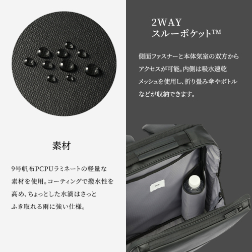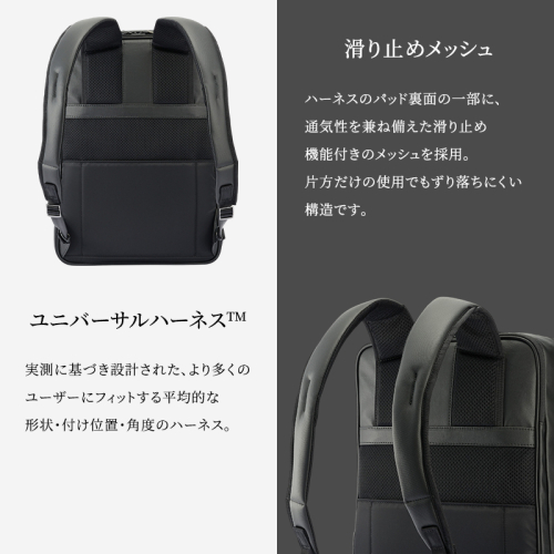 機能一覧:2気室/B4ファイル収納可能/15.6インチPC収納可能/セットアップ機能(キャリーバッグ連結)/バーテクト(R)ポケット(抗ウイルス・抗菌加工)/スリムデザイン/チェストベルト付
