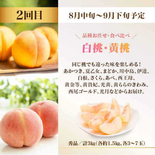 【定期便2回目】:白桃と黄桃の食べ比べセット(品種お任せ)約3kg (各約1.5kg、各3~7玉)秀品