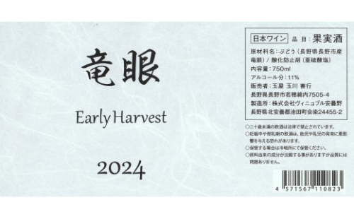 - ワイン 竜眼 Early Harvest 750ml・2本 長野県長野市若穂 長野県北安曇郡池田町 ぶどう(長野県長野市産 竜眼)/酸化防止剤(亜硫酸塩)アルコール分:11% 長野市産ぶどう竜眼 白ワイン 辛口 750ml×2本