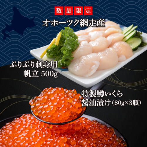 オホーツク網走のぷりぷり刺身用ホタテ500gと特製鱒イクラ醤油漬け80g×3本のセットです。
