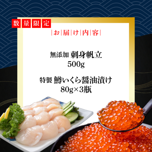 かにやで人気の無添加刺身帆立500gと特製鱒いくら醤油漬け80g×3瓶合計240gセット ABAO122