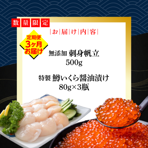 - 【定期便】かにやで人気の無添加刺身帆立500gと特製鱒いくら醤油漬け80g×3瓶合計240gセット 全3回 ABAO123