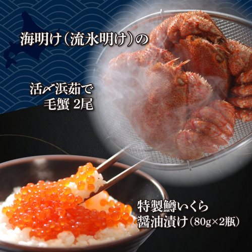 海明け(流氷明け)の活〆浜茹で毛がに2尾と、特製鱒いくらの醬油漬け80g×2瓶をセットでお届けします。