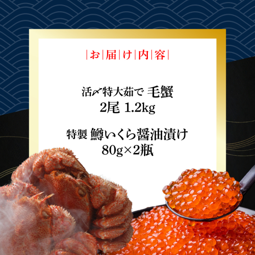 かにやの厳選網走流氷海明けの「活〆特大茹で毛蟹2尾で1.2kg」と「特製鱒いくら醤油漬け80g×2瓶」セット ABAO128