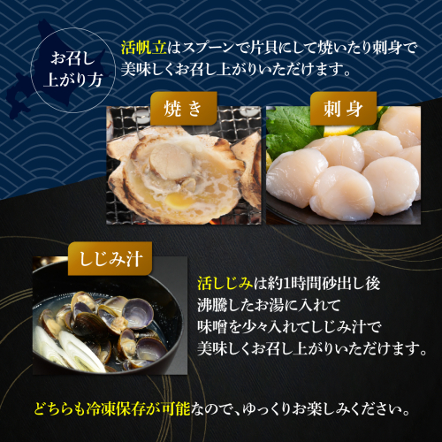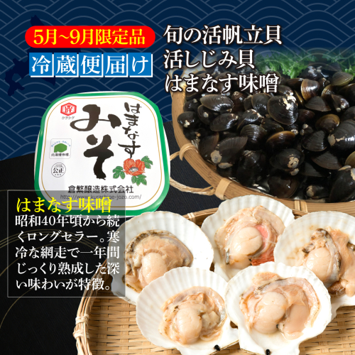 旬の活帆立貝・活しじみ貝・はまなす味噌・冷蔵便届け5月~9月限定品にてお届け致します。