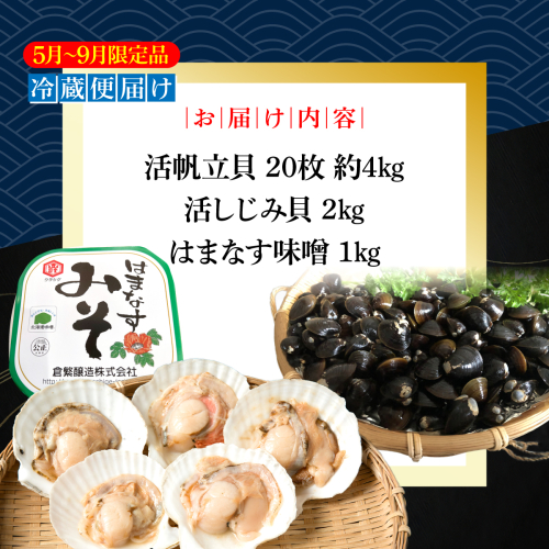 - 活帆立貝20枚約4kgと活しじみ貝2kgとはまなす味噌1kgセット ABAO131
