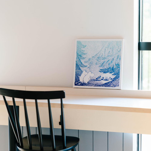 生地として販売されている素材をフレームに取り付ける一般的なファブリックフレームとは異なり、専用にデザインした柄を1点ずつプリントして使用しているので、フレームサイズピッタリの柄でムーミンアートをお楽しみいただけます。