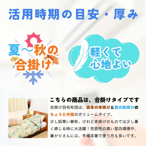 合掛け羽毛布団は、真冬の本掛けと夏の肌掛けの、丁度中間のボリュームタイプです。