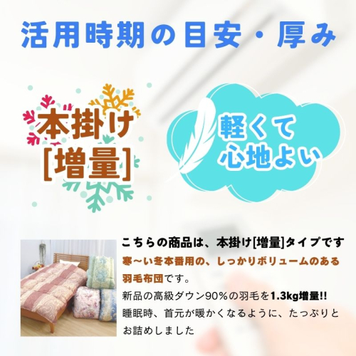 新品の高級ダウン90%の羽毛をさらに増量1.3kgお詰めした、ボリュームたっぷり仕上げです。
