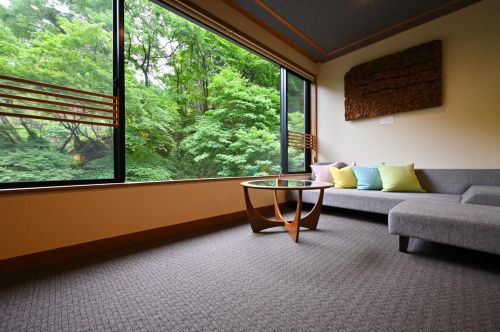 和室と談話スペースの2室を揃えた、大松閣で最高グレードのお部屋です。大きな窓から見下ろす渓谷の景色は、晴れ晴れとした心持ちへとあなたを誘います。