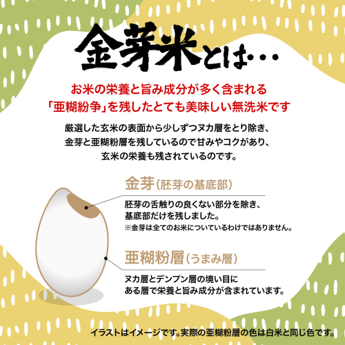 「金芽米」は、従来の精米方法ではぬかと一緒に取り除かれてしまう玄米の栄養分とお米本来の美味しさ・旨み成分を特殊な精米方法により残した健康志向のお米です。とがずに炊けるので「とぎ汁」を出さず水の節約にもなる「環境にやさしい無洗米」です。