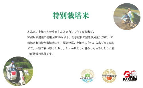 本品は、節減対象農薬の使用回数50%以下、化学肥料の窒素成分量50%以下で栽培された特別栽培米です。