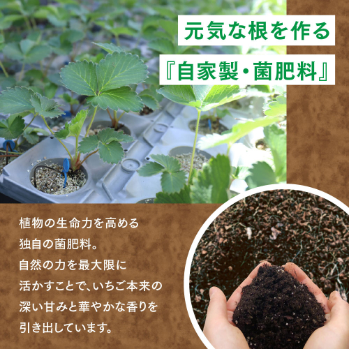 土に触れない清潔な環境に加え、いちごの根を元気にする自家製の菌肥料を使用し、