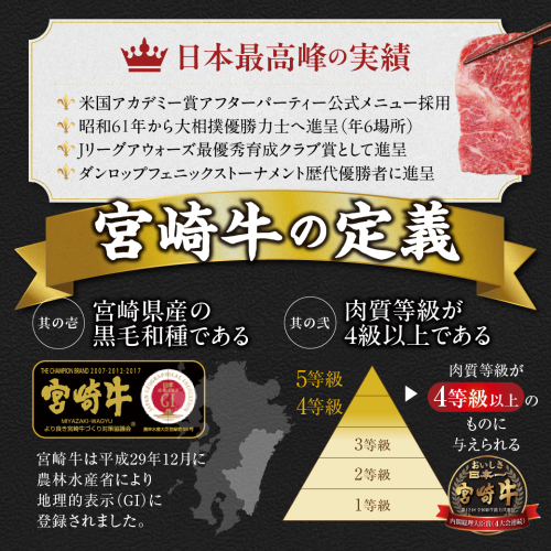 宮崎で生まれ、宮崎で育ち、指定された父牛を持つ黒毛和牛で5等級・4等級のものだけに『宮崎牛』の称号が与えられます。