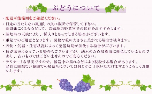 皮が薄いためそのまま食べることができます。他のぶどうに比べて天候の影響により裂果しやすく栽培が難しいと言われている品種です。シャインマスカットに負けない濃厚な味わいをお楽しみください!