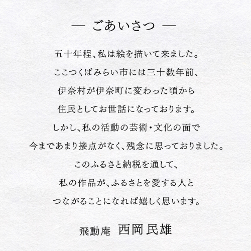 このふるさと納税を通して、私の作品が、ふるさとを愛する人とつながることになれば嬉しく思います。